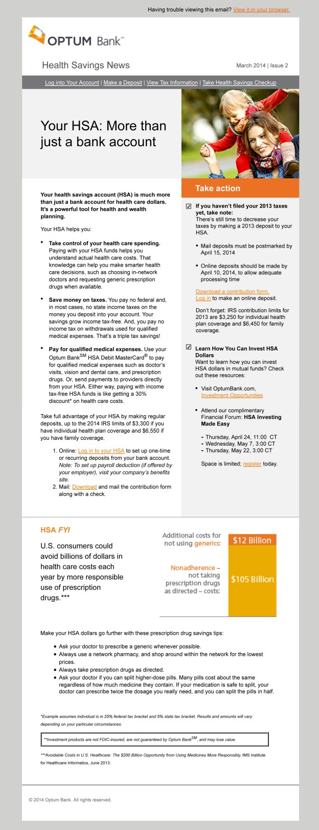This bimonthly newsletter was emailed to health savings account holders. Logos, links, and call to action were dynamic by brand. Responses were tracked by brand, clicks, incremental deposits, and subject line.